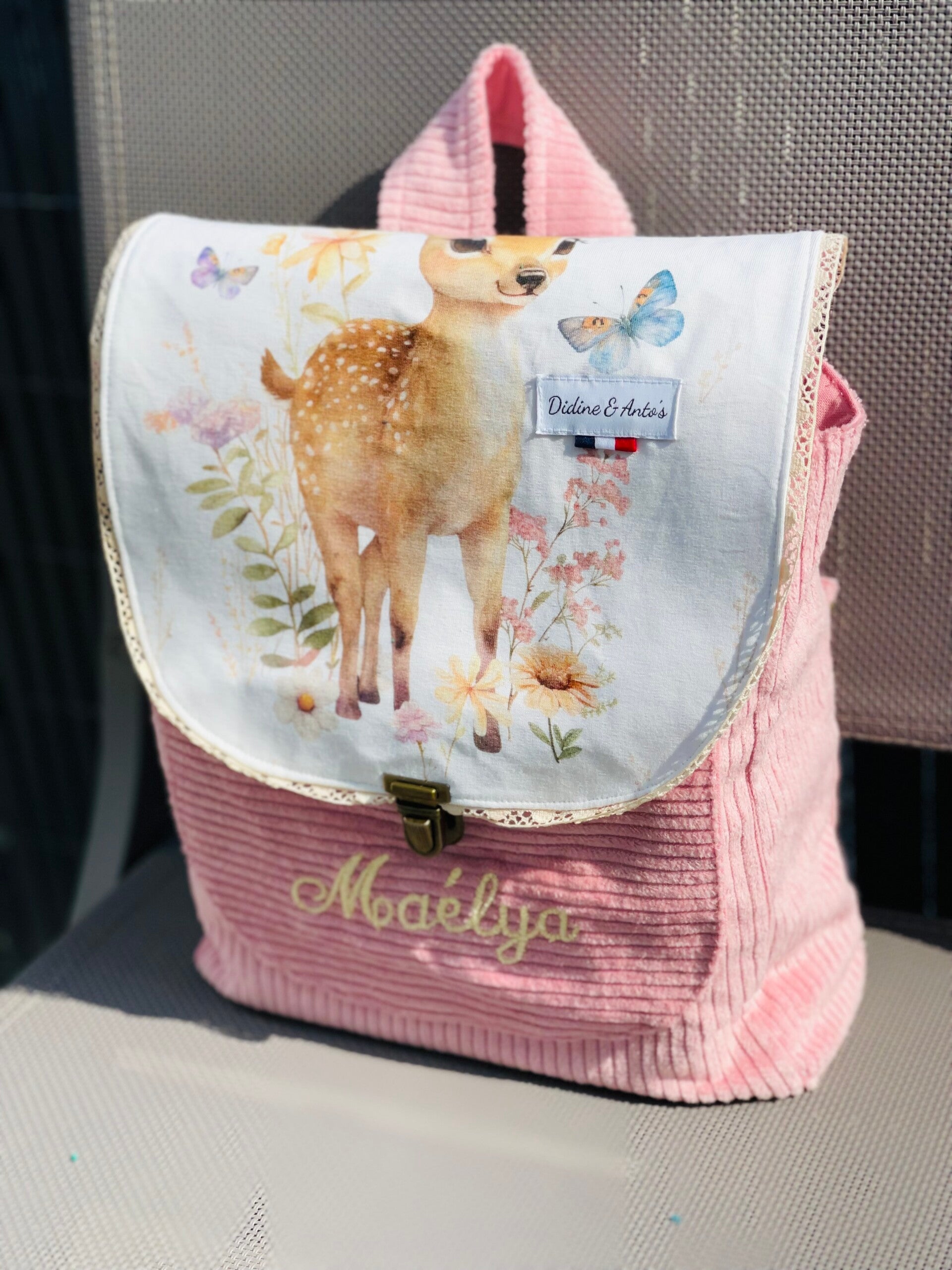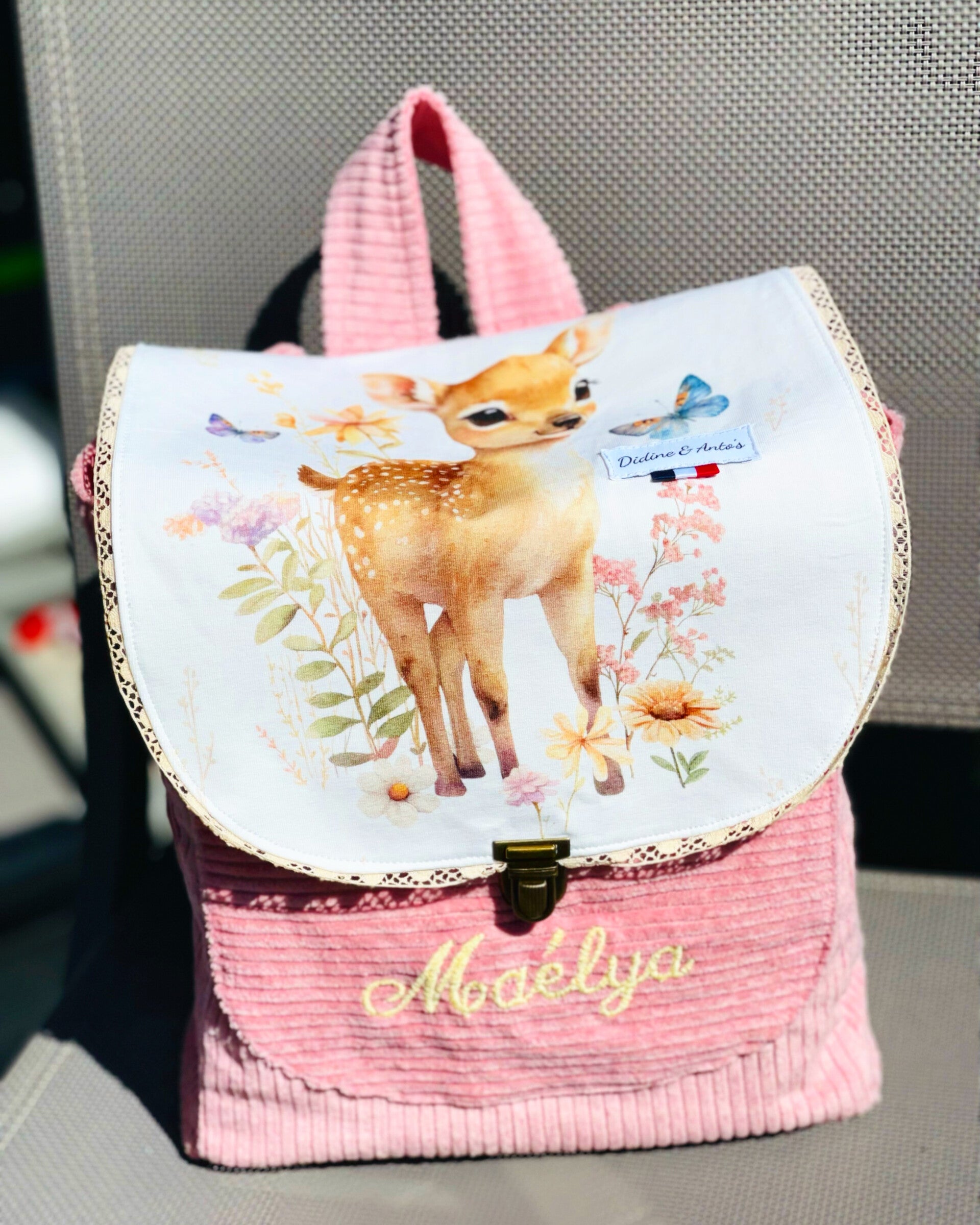 Cartable maternelle biche vanille fraise 🍓 , tissus jersey rose , intérieur tissu coton oeko-tex premium. Rabat biche