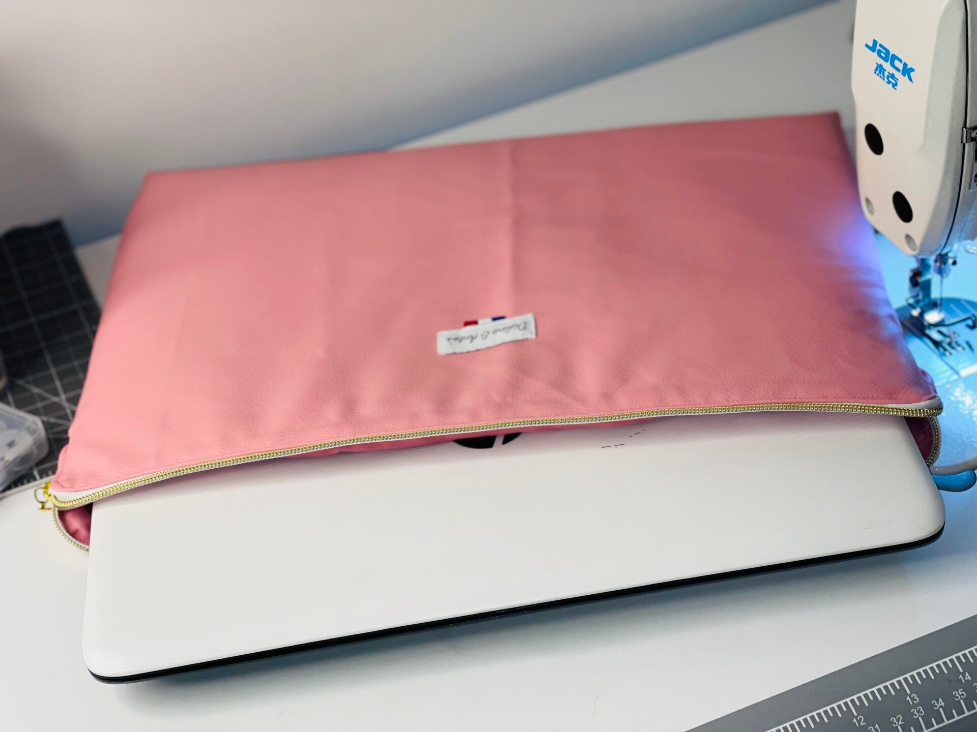 Housse d'ordinateur en simili cuir rose et intérieur tissu imperméable.