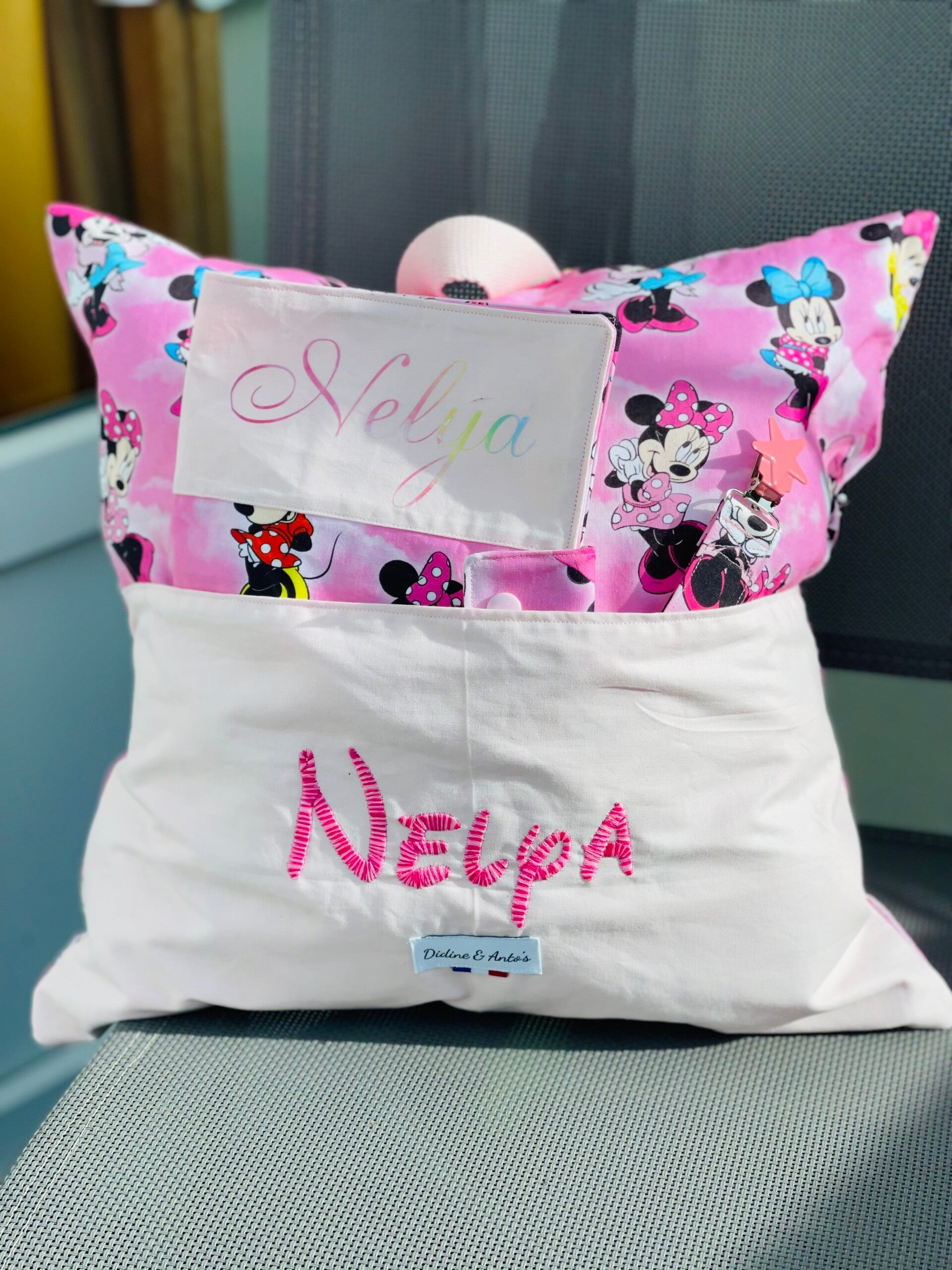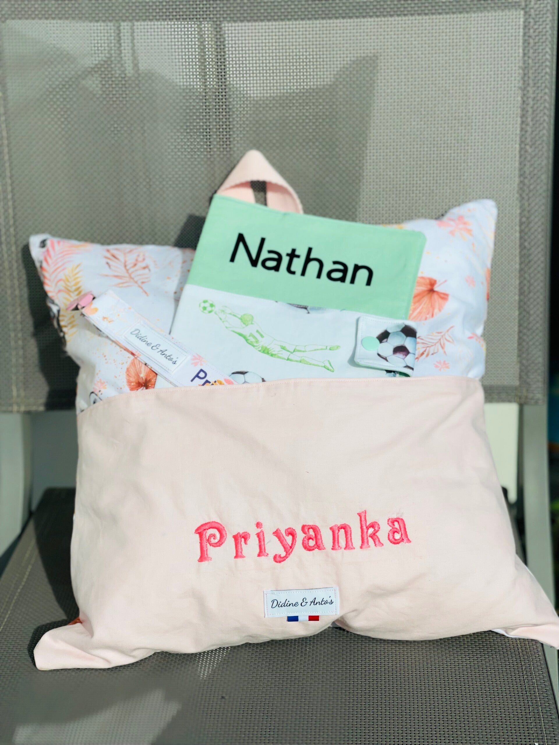 Lot coussin de rangement , attache tétine et protège carnet de santé. Personnalisé