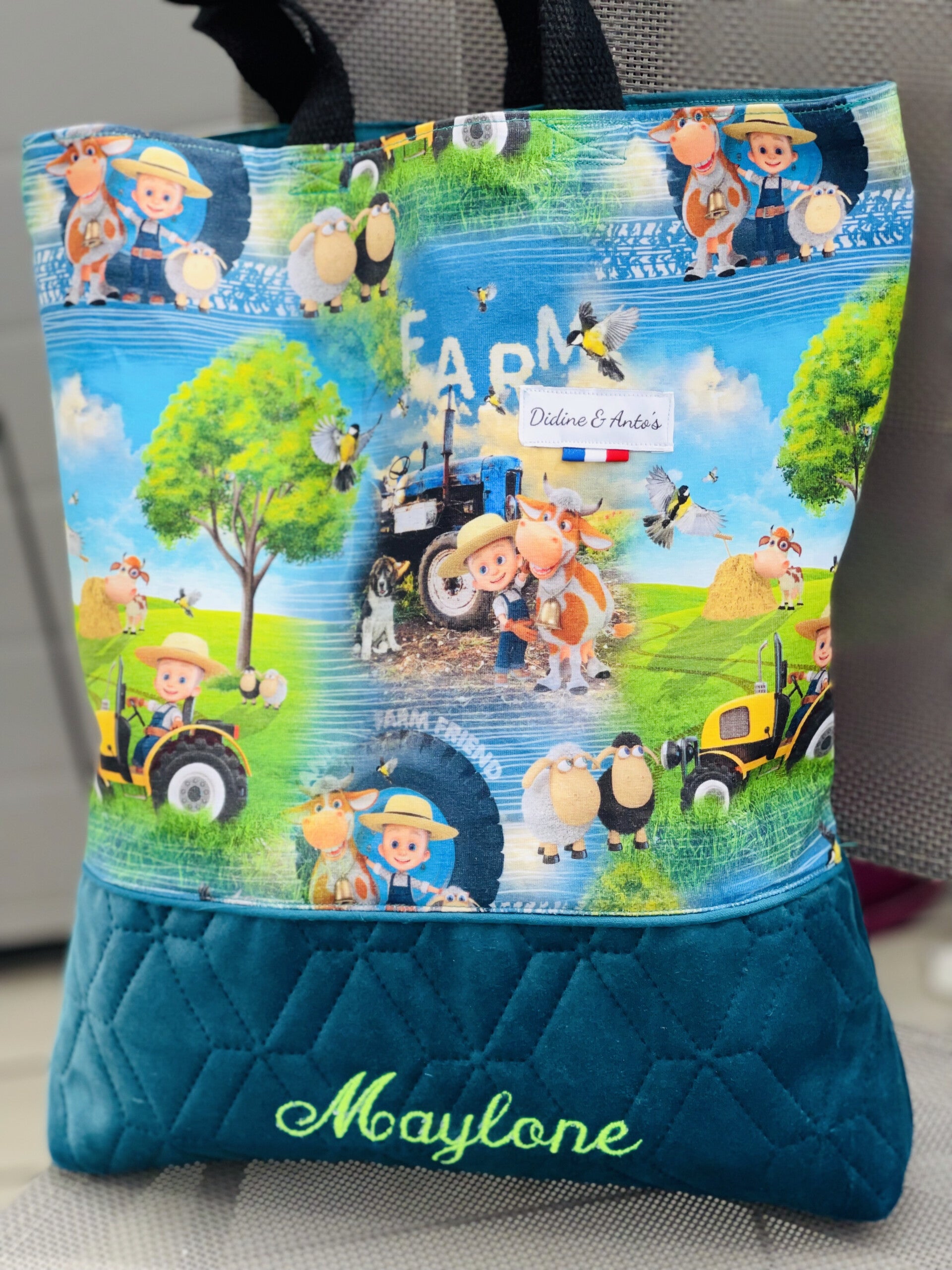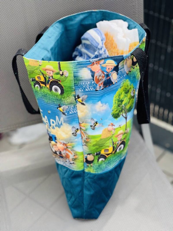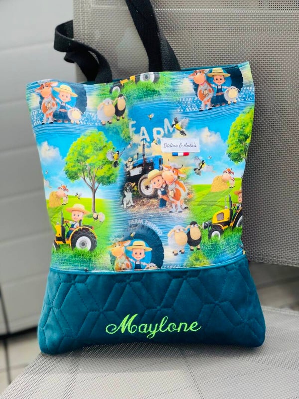 Tote bag à motifs tracteurs fermier et ses animaux et tissus velours matelassés .
