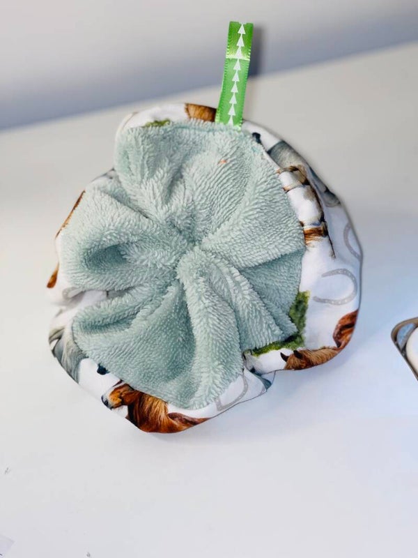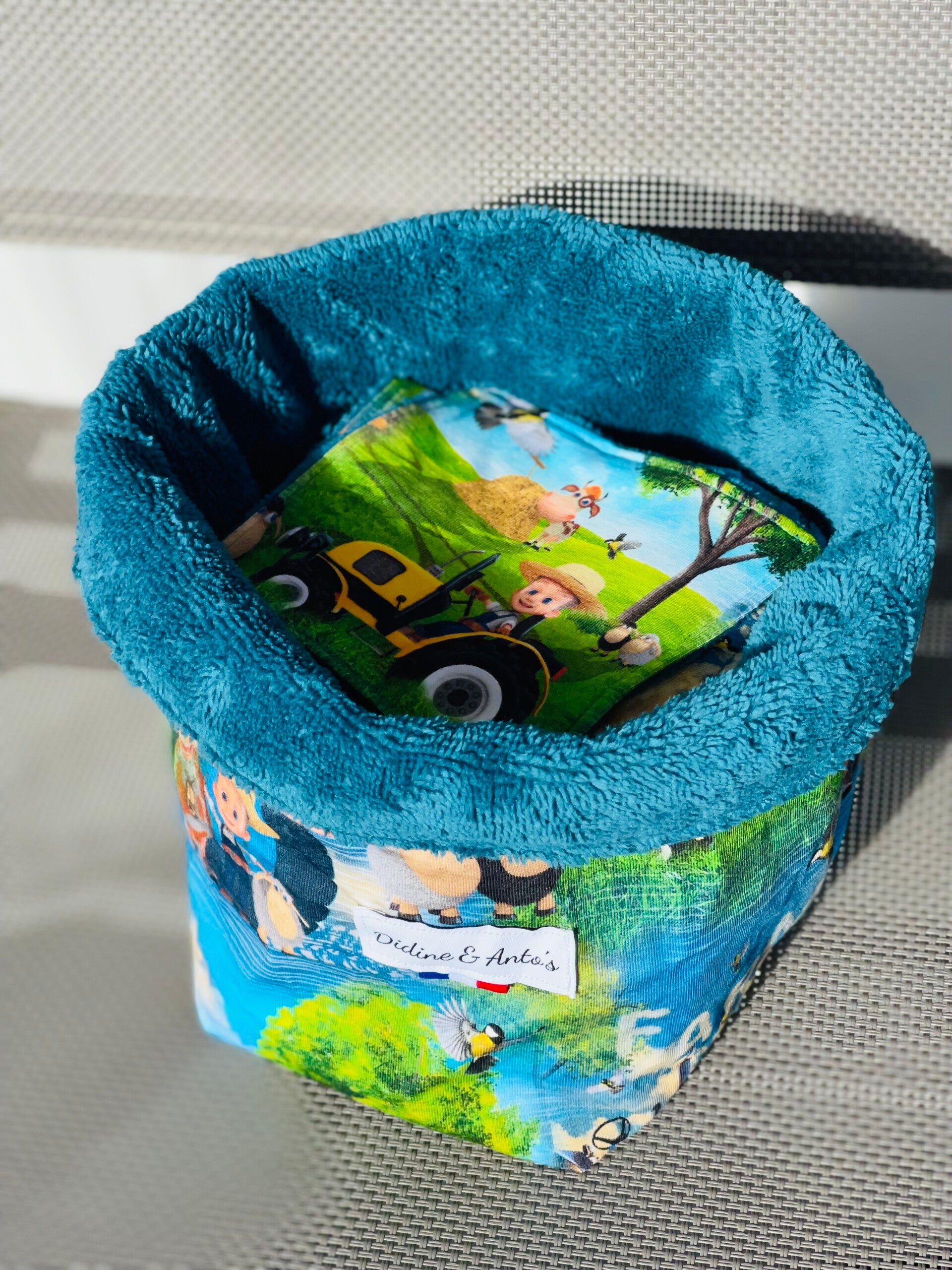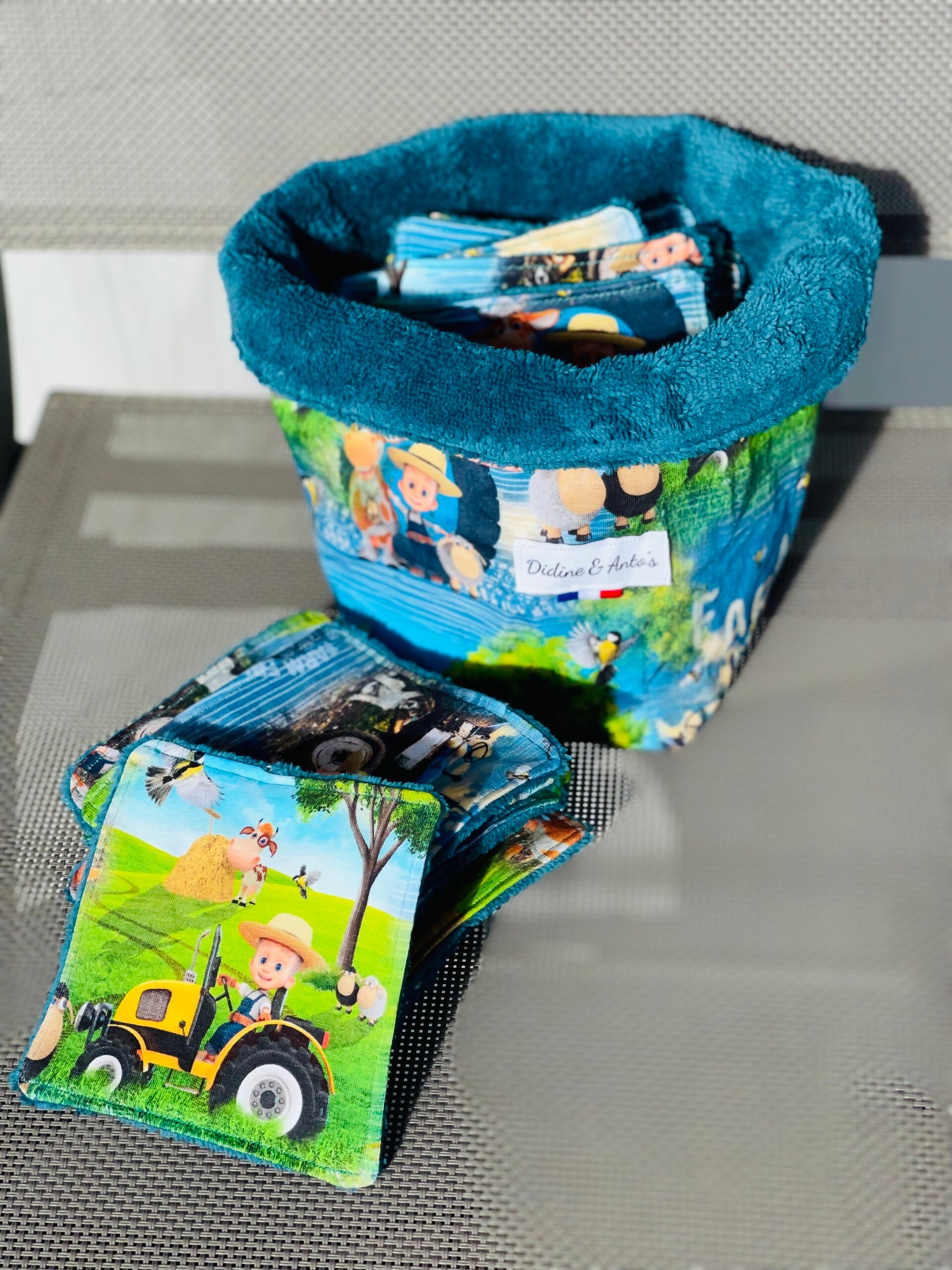dans ce lot 20 lingettes, un panier et une fleur de douche. La fleur de douche est offerte avec 2 lingettes. tissus coton à motifs et tissu éponge bambou.