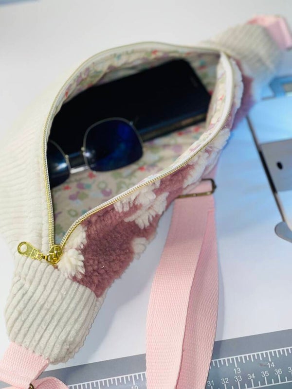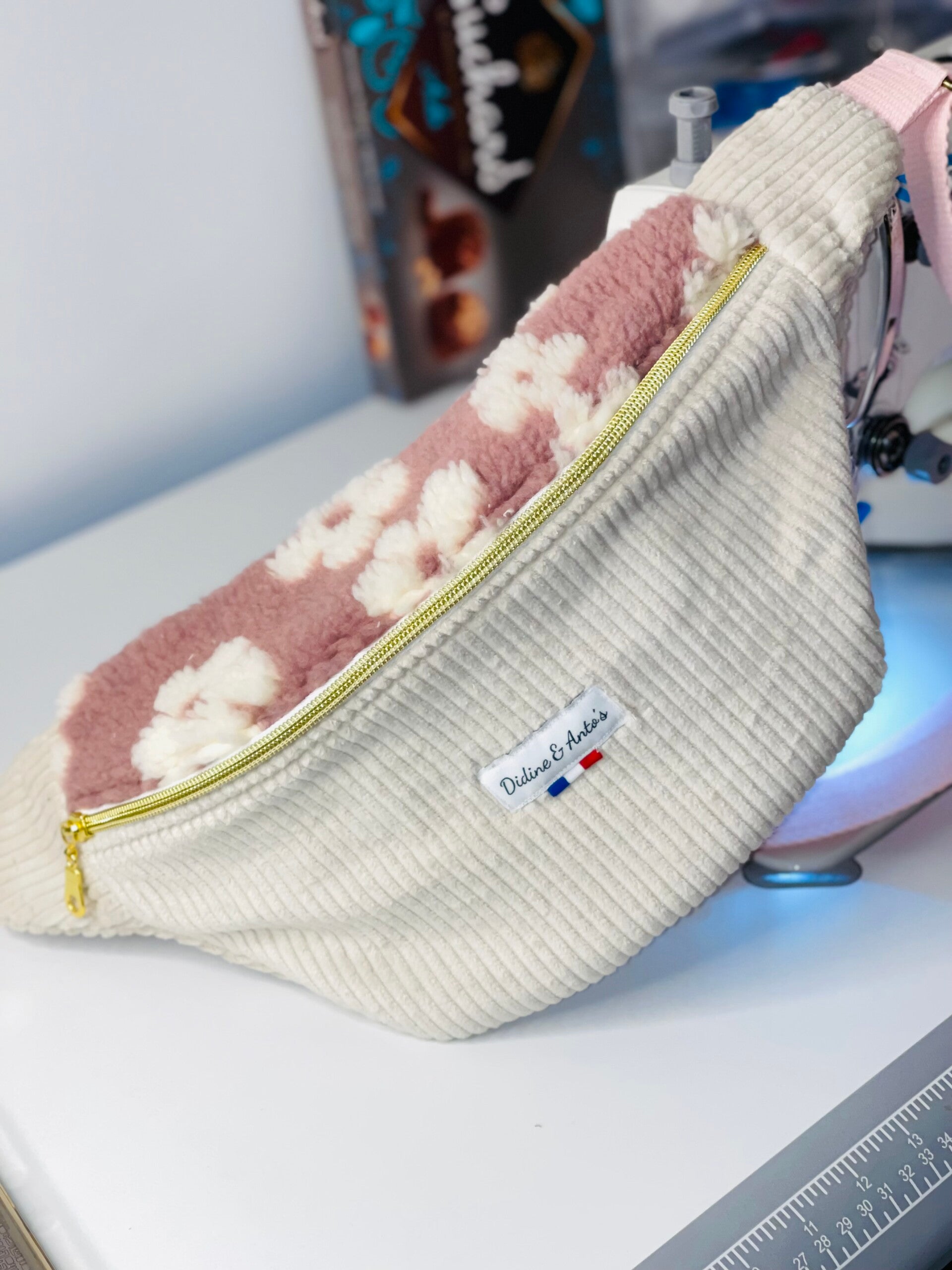 Le rabat de cette banane est cousu dans un tissu imitation peau de mouton.