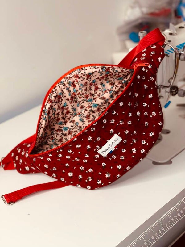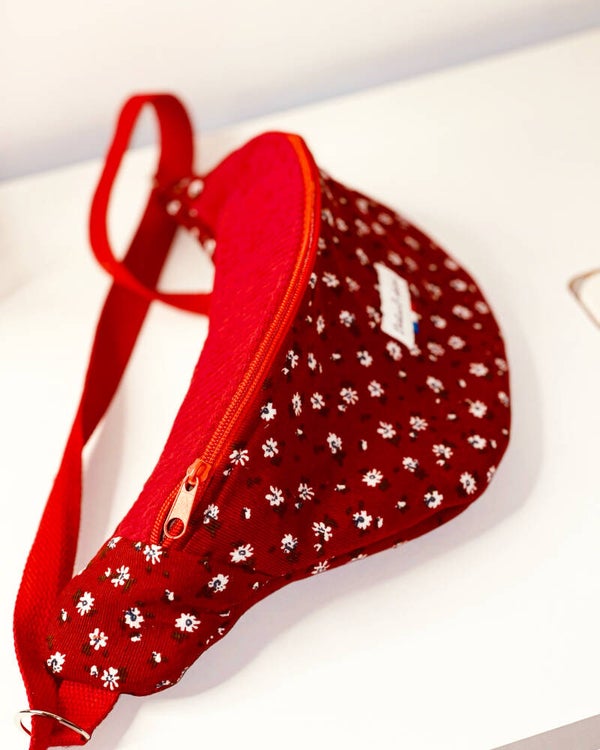 Le rabat de cette banane est cousu dans un tissu velours côtelé framboise et le corps tissu velours milleraie fleuri.