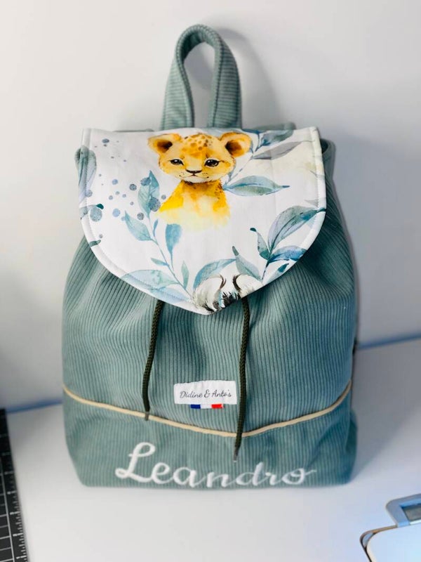 Sac pour la maternelle/ crèche ... en velours côtelé / tissu savane lionceau coton / pression magnétique et cordelette pour refermer...