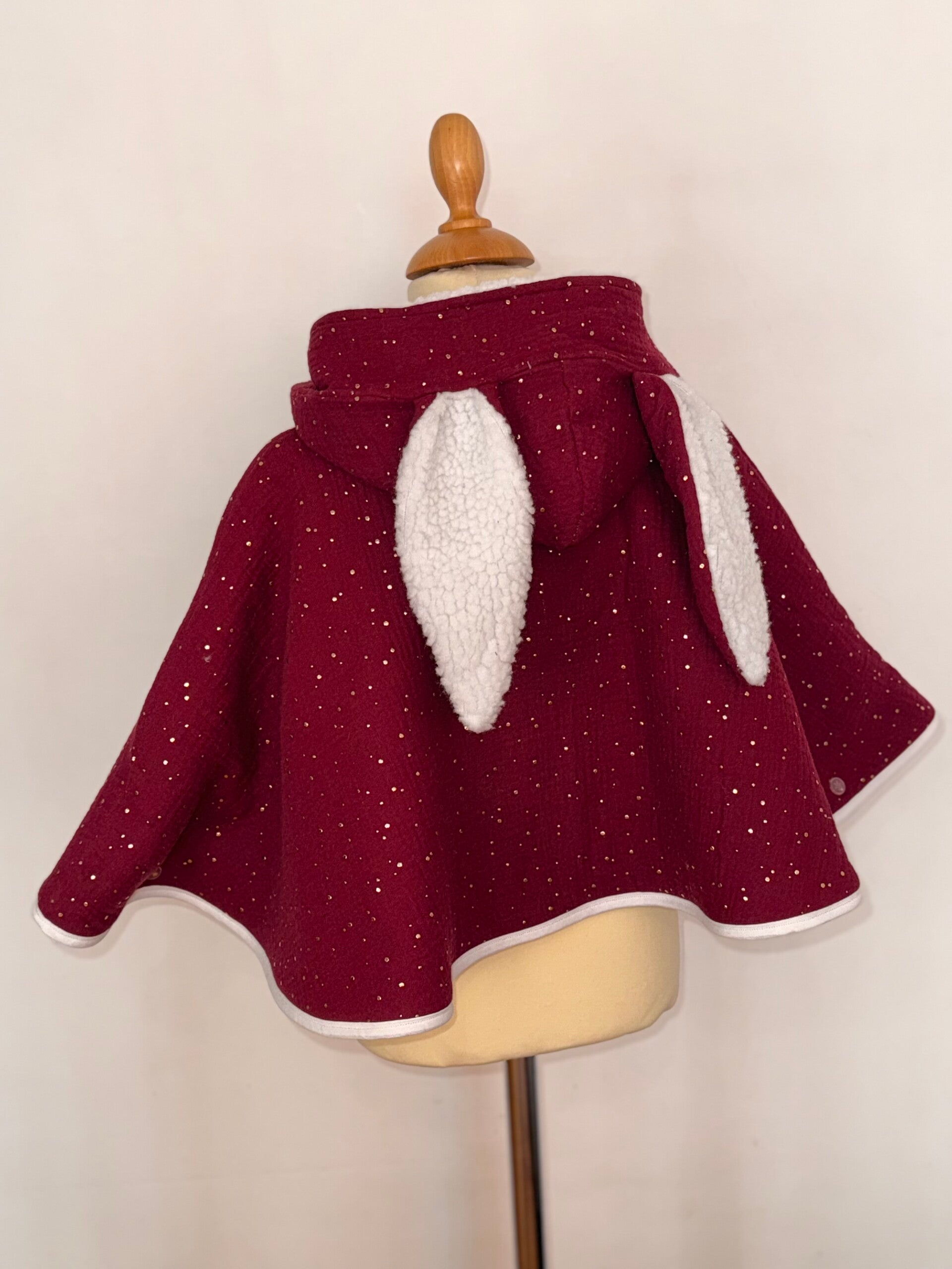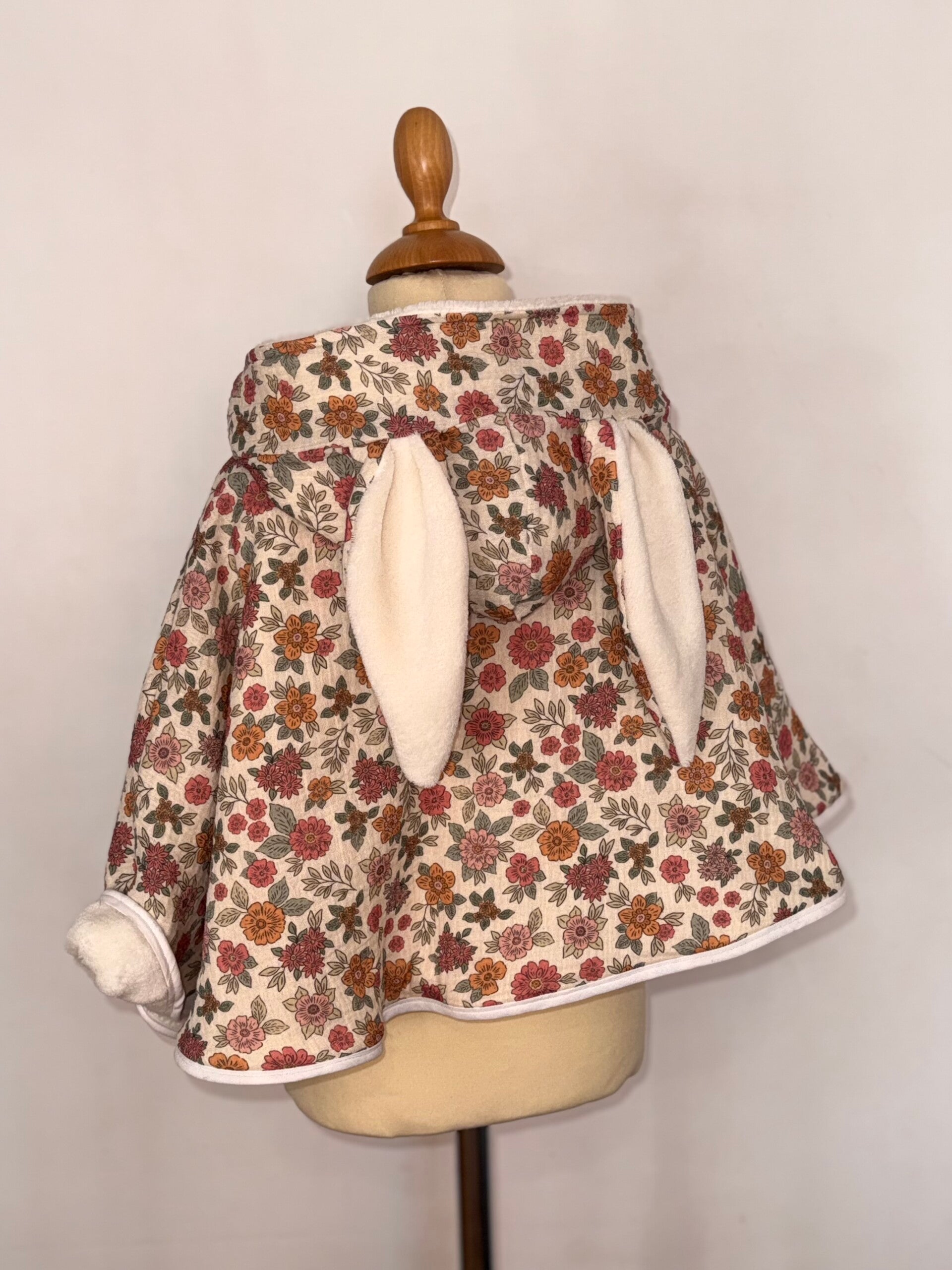 Finitions soignées avec la pose d’un biais blanc, le poncho est proposé en plusieurs tailles :